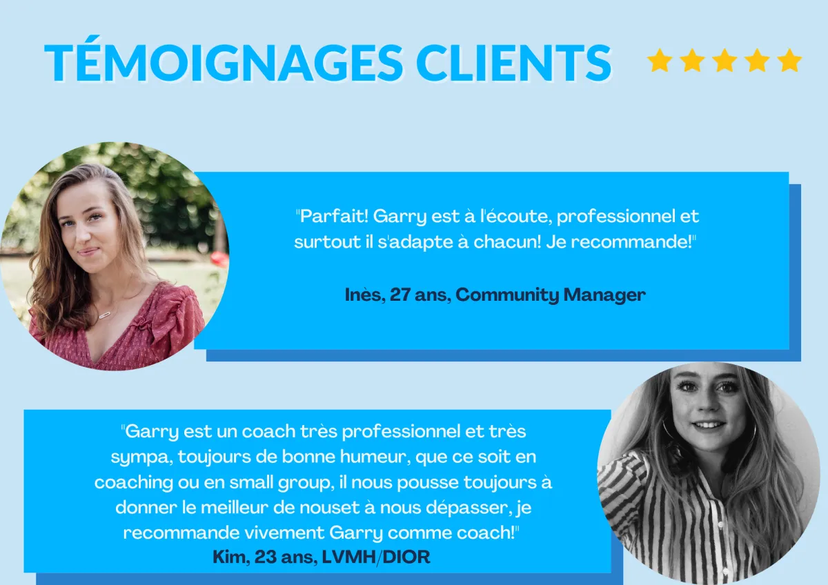 C’est justement pour ça qu’on existe. Avec GA Coachs, tu ne dois pas venir avec une clientèle, tu viens pour en construire une. Notre méthode, notre visibilité (polo bleu, QR code, affiches, livret de vente), et notre accompagnement te permettent d’en avoir 3 à 5 rapidement, même si tu pars de zéro..